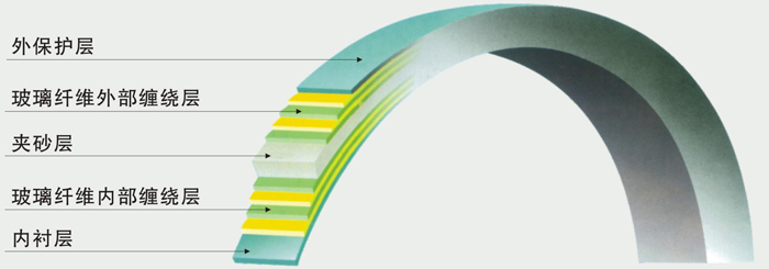 管壁结构:由拉伸强度很高的玻璃纤维起着骨架增强的作用,而由耐压、耐磨性较强的合成树脂作为基本材料,粘结纤维和石英砂,起到共同的成型和承载作用。